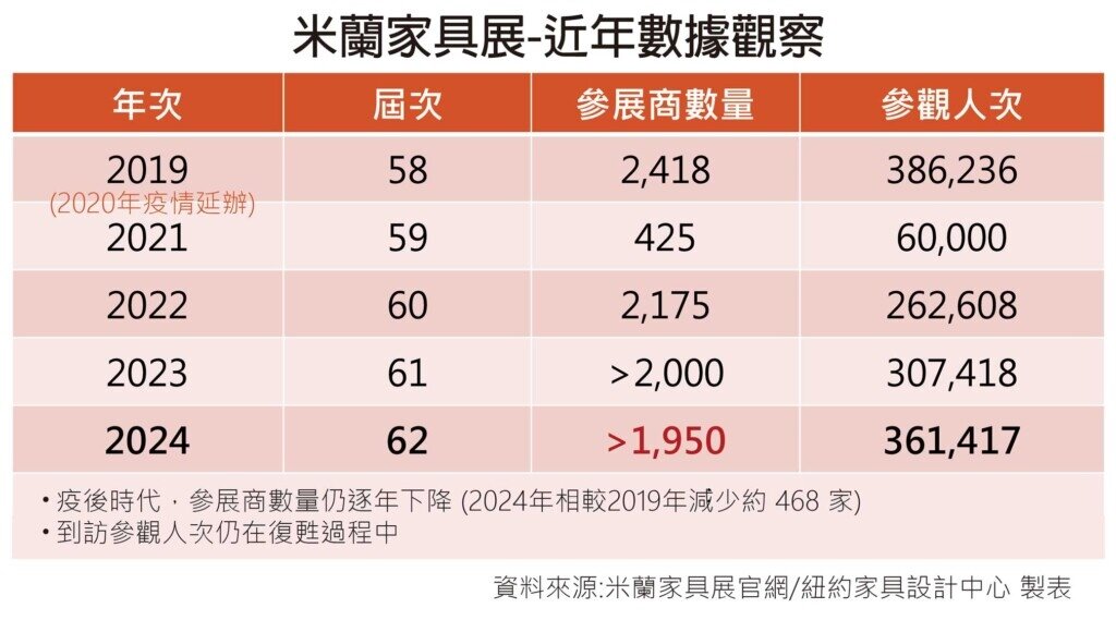 米蘭國際家具展被譽為全球家具產業的奧林匹克盛會。徐培原分享今年展覽以「Where experience evolves」為主題,以空間概念的多元定義,透過觀察近年的展覽數據和趨勢,可洞察家具產業的發展趨勢和未來方向。儘管疫情後參展商數量持續下降,2024年相較2019年減少約468家,但到訪參觀人次仍在復甦。