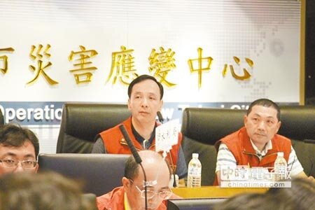 新北市長朱立倫及副市長侯友宜22日共同主持天鵝颱風災害應變中心工作會報。據天氣風險管理中心預測,天鵝颱風帶來的降雨仍會集中於上次受災區,提醒相關單位須注意。