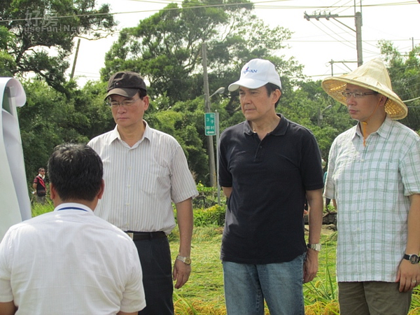 上午9時,馬總統在吳縣長、行政院農委會副主委胡興華及縣府農業局長曾榮鑑等人陪同下,先前往新屋鄉中興路807號一帶的農田,勘察一期水稻作物在風災後受損情形,並聽取相關人員簡報。