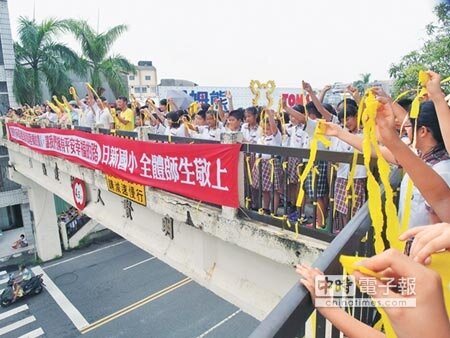 「再見了!明賢陸橋」市府工務局計畫拆除全市9座使用率偏低的陸橋,29日晚上率先拆除南區日新國小前的明賢陸橋。日新國小為感謝這座守護該校師生30多年的陸橋,昨天上午發動全校4至6年級師生替陸橋繫黃絲帶,並紀念這段為建造陸橋走上街頭抗爭的往事。