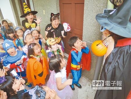 不給糖就搗蛋!新北各地昨四處可見萬聖節氣氛,三重碧華布街以「布牛文化萬聖嘉年華」號召千名幼童打頭陣變裝踩街;三峽、沙崙、頂埔等學校師生,扮成大南瓜、虎克船長;英速魔法學院外籍老師的吸血鬼裝扮更是維妙維肖,增添西洋風情。