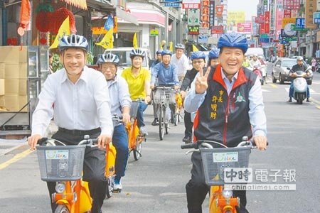台北市長郝龍斌(左)7日在竹市與新竹市長許明財共同騎乘YouBike,並分享北市的推動經驗。