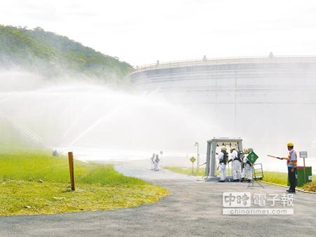 中油桃園煉油廠21日進行汽油添加劑管線洩漏演練,消防人員以水線降低油槽溫度。(記者甘嘉雯/攝影)