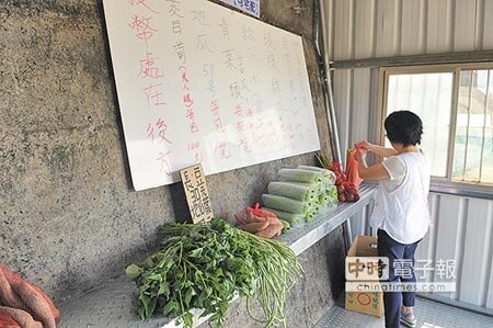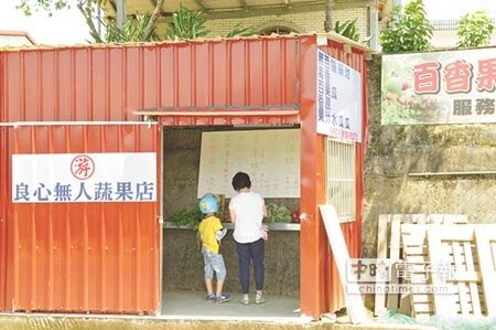 南投縣埔里鎮中台禪寺路邊近日出現1間「良心無人蔬果店」,農民游輝達平常顧菜園無暇顧店,就在往中台禪寺的路上蓋間鐵皮屋,陳列一早採收的新鮮蔬果;經營兩個多禮拜以來收入略有短收,但他認為有良心的人終究是多數!