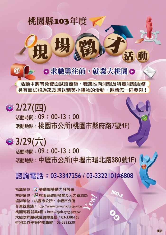 桃園縣政府勞動及人力資源局策劃的103年第一季大型現場徵才活動,於2月27日、3月29日分別假桃園、中壢兩地市公所舉行,每場次將邀請30家廠商參加,歡迎欲求職、轉職民眾與求才廠商參加。