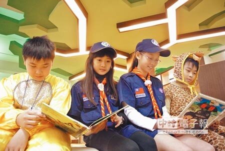 新莊新泰國小改造閒置宿舍,「花園故事館」大受歡迎。圖為新泰改造校舍的另一傑作「叢林書屋」,穿著動物裝的學童與幼童軍坐在大樹造型的閱讀區看書,有如徜徉叢林間。