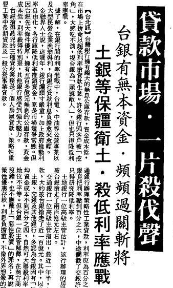 1986年的房市復甦先從土地行情啓動,尤其台北市土地標售創出亮眼佳績,接著台銀貸款更從利率8.2%下調至7.5%,引起銀行殺低利率應戰。