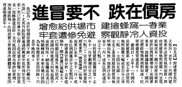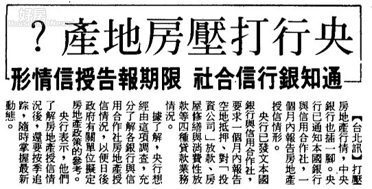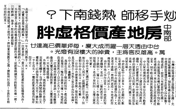 1980年代房產反彈爆發又以1986至1988年2年漲價最兇猛,1989年開始受到民眾抗議高房價,央行也先從選擇性信用管制開始著手,並發佈短、中期解決房價方案,並要追蹤房地產異常交易的資金來源。