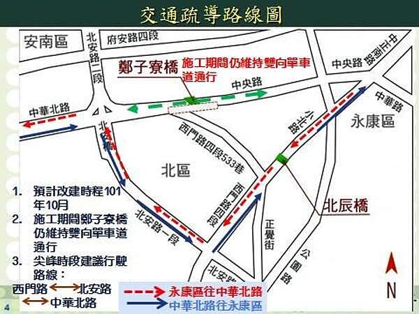 水利局表示,為了避免市區交通混亂,因此該局由路面較寬,車流量相對較少的北辰橋先行施工,歷經約1年,已於今年8月全線通車,而開元橋亦經過1年餘的施工,已於今年9月中先行單線雙向通車,交通已獲大幅紓緩,而最後一座鄭子寮橋亦將於10月16日開始進行施工。