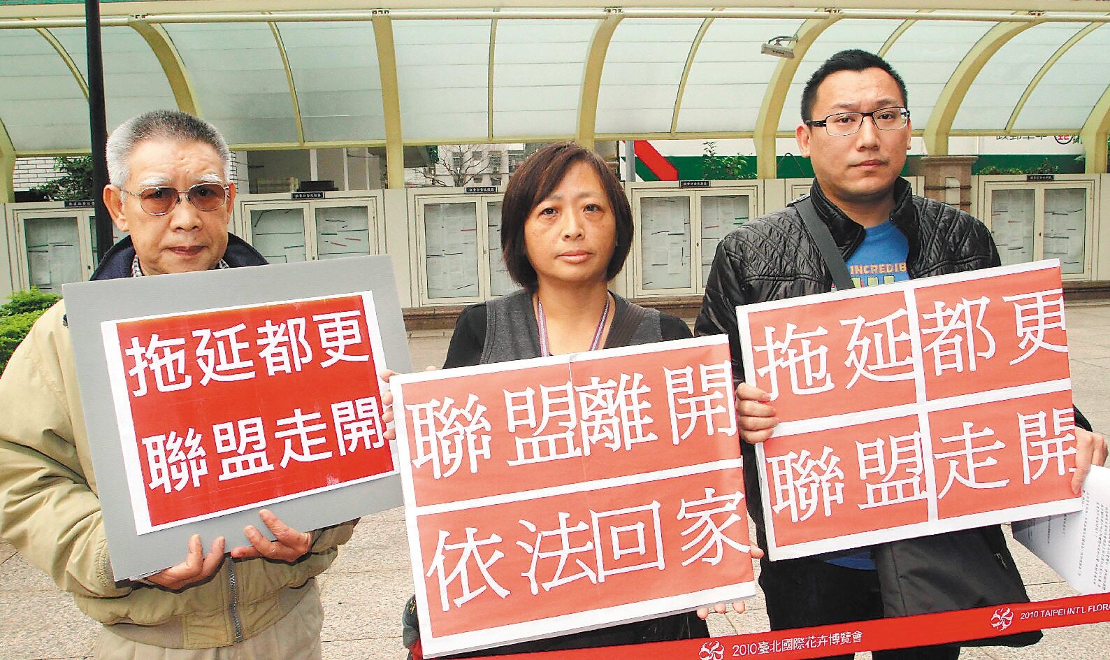 文林苑都更同意戶昨天也到士林地院,向辦理反擔保金提存的文林苑都更不同意戶王家抗議,要求台灣都更受害者聯盟離開文林苑。(記者蘇健忠/攝影)
