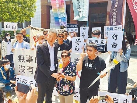 21年前震驚社會的歸仁雙屍命案,原本遭判死刑的謝志宏(前排黑衣戴墨鏡者)去年無罪確定,因冤獄18年,可獲刑事補償2391萬9000元,他聲請覆審後,補償金可望再高。圖/中時電子報資料照片