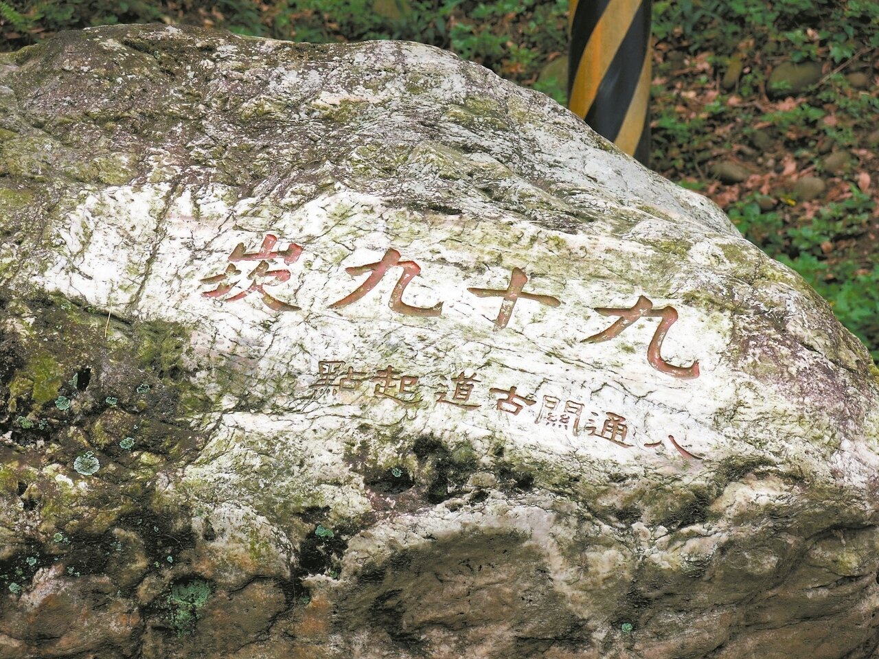 一路望去是平野開闊的雲嘉平原及濁水、清水兩溪,沿九十九崁的階梯而下,另一棵大石上,更鑴刻著「九十九崁,八通關古道起點」,證明竹山自古是「入番地」、通東台灣的後山總通道入口。