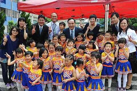 市長朱立倫、市議員蔡淑君及林口區長林耀長等出席動土典禮與學生合影。(記者黃村杉攝)