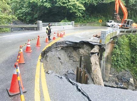 連日豪雨不停,13日凌晨,從仁愛鄉霧社往埔里方向的台14線75.6公里處(忠勇橋前),橋下游端攔砂壩斷裂毀損,河床持續向下沖刷,使翼牆基礎流失,路基坍滑,出現長25公尺、深約18公尺、寬約4公尺的大坑洞,僅可單線通車,警方與埔里工務段進行前後交通管制。