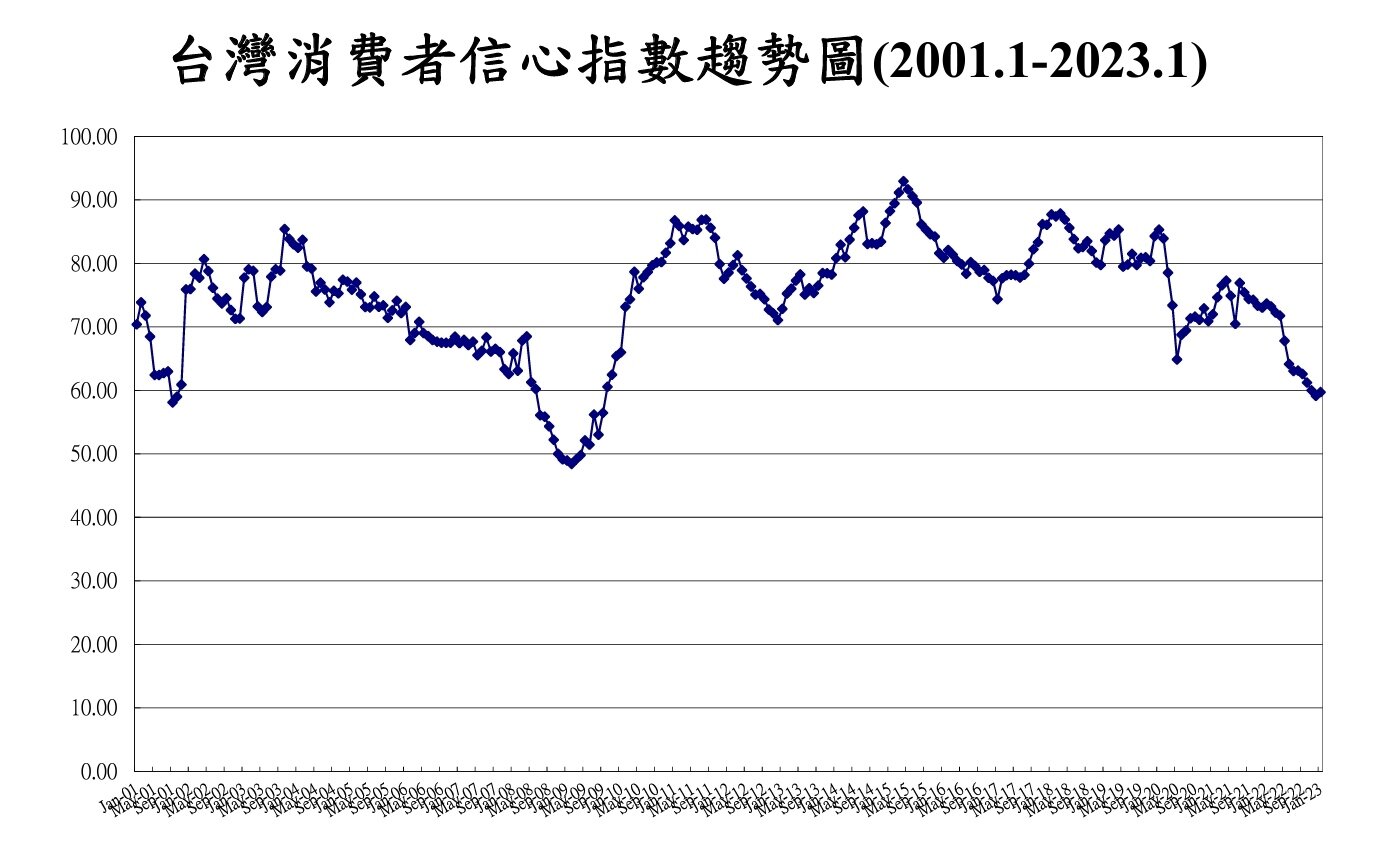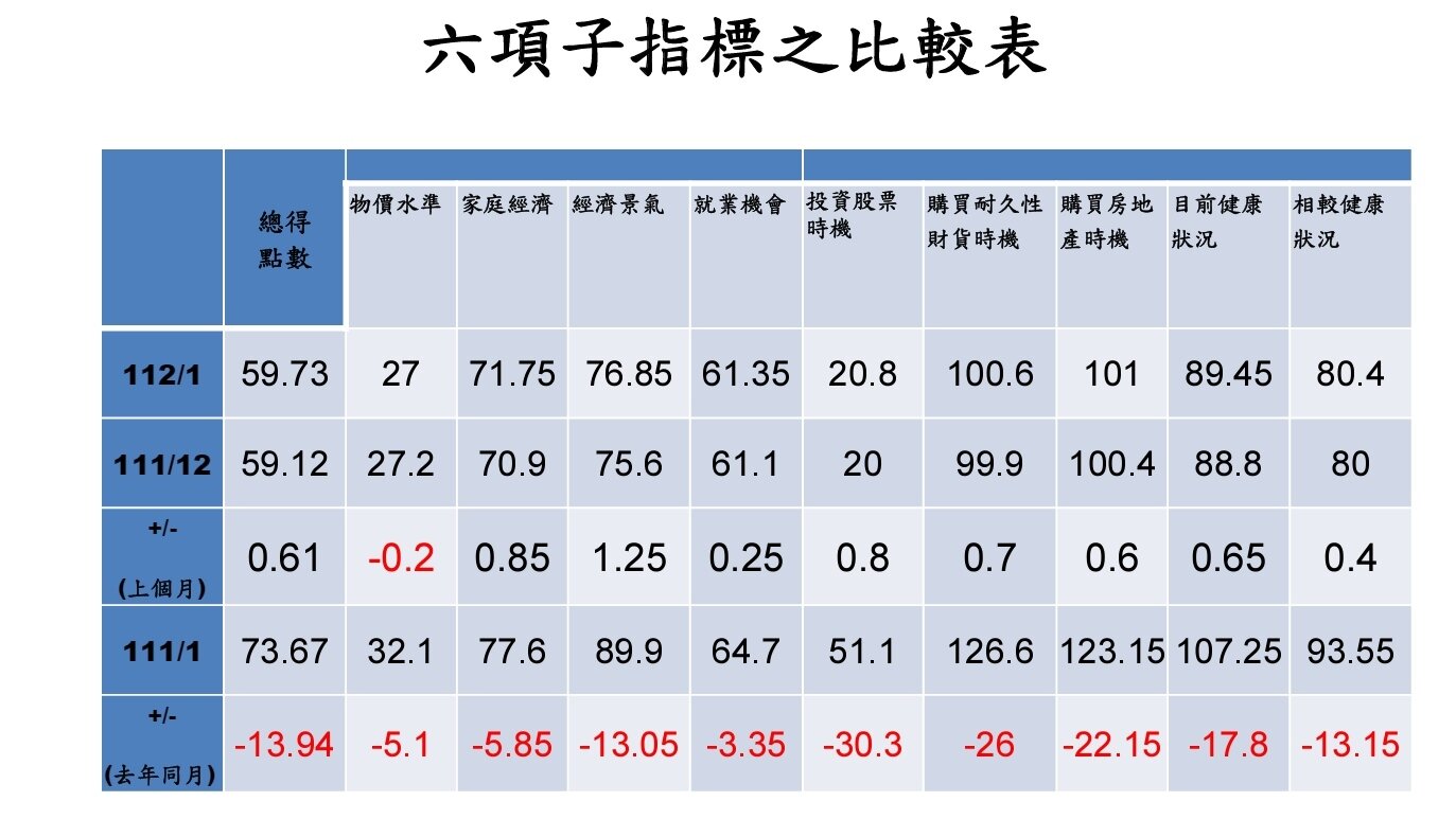 國立中央大學台灣經濟發展研究中心調查今年1月消費者信心指數(CCI)總指數為59.73點,雖較上個月上升0.61點,終止連4跌情況,但仍屬於相對悲觀。6項分項指標中,包含購買耐久財、國內經濟景氣、家庭經濟狀況、就業機會、投資股市時機共5 項上升,又以「未來半年國內經濟景氣」上升1.25點達75.6,上升幅度最多;僅物價水準的指標下降。