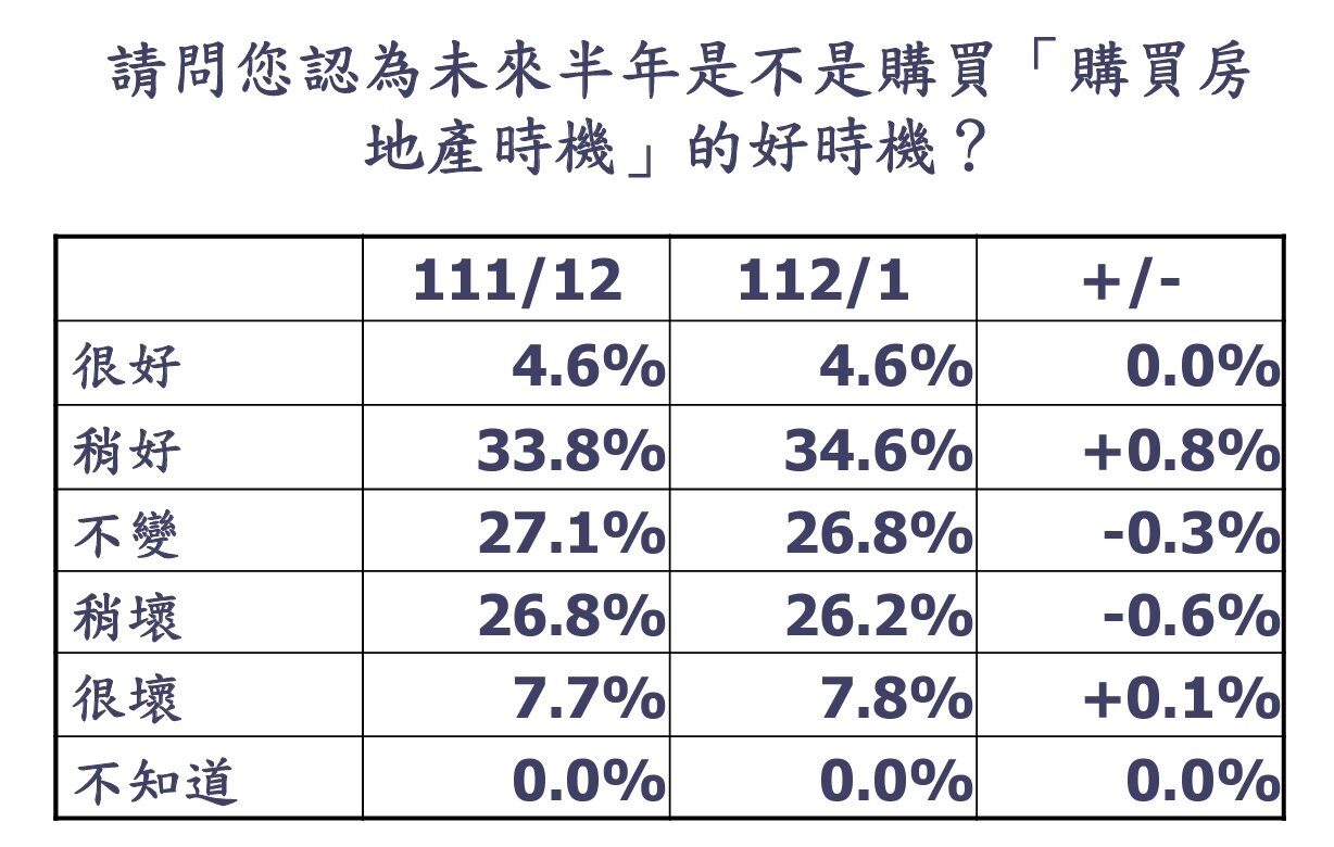 台灣房屋集團趨勢中心協理江怡慧表示,主要是去年12月的數據達史上新低,唯一樂觀的只有房地產指數,今年1月隨著物價穩定、沒繼續飛漲,消費信心才回升,可說是對整體信心層面止跌回升。