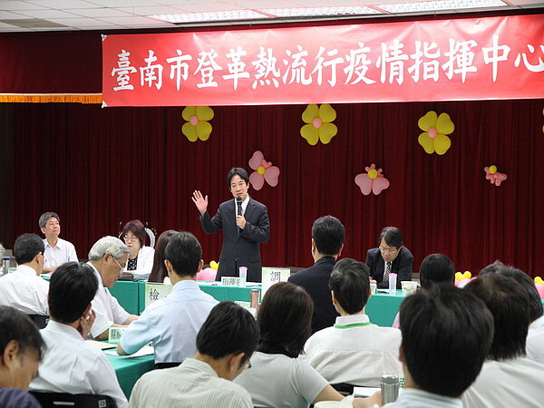 市長賴清德29日主持「台南市登革熱流行疫情指揮中心」會議時表示,登革熱是屬社區傳染病,與SARS不同,SARS疫情是社區無法自行防範,但是登革熱只要有孳生源在就會爆發疫情流行,因此第一線防疫定是要從社區本身動員起,區長即是前線指揮官,帶領著里長、志工從戶外、空地、挨家挨戶地毯式的調查、清理、宣導,不可放過任一個角落,徹底落實孳生源的清除。