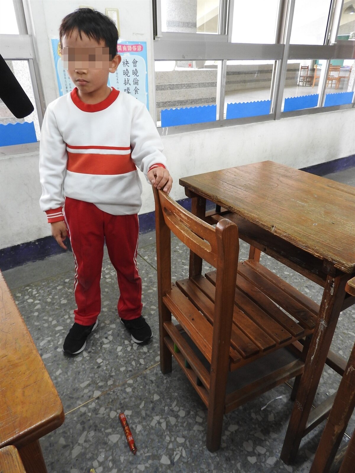 校方指出,今天上午8時許,一年級師生在校內鄉土語言教室準備上課時,有學童在桌椅下方發現1根紅色包裝的不明物品,因上頭寫滿簡體字,孩子覺得可疑,當下就馬上報告老師,經師檢視確認,竟是來自中國江西的火腿腸零嘴。