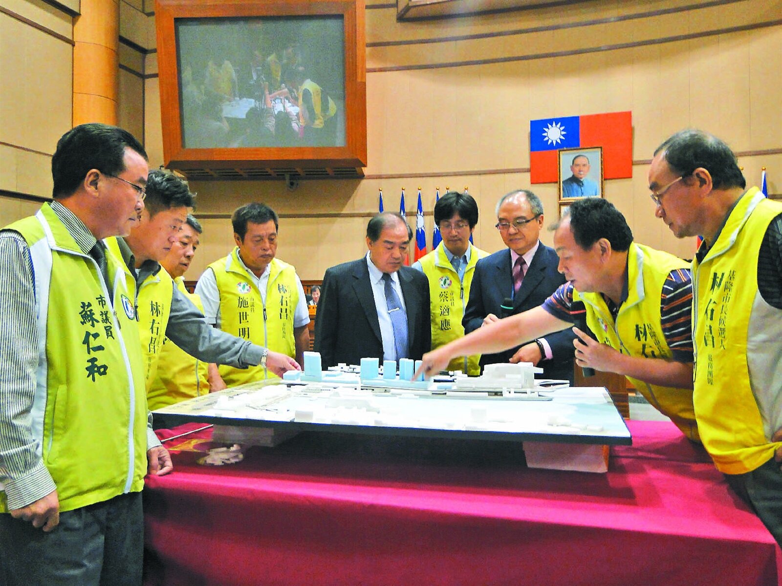 民進黨基隆巿議員昨天在議會質詢時,搬出自製的西二、西三碼頭倉庫模型,提議比照高雄駁二藝術特區,在基隆港邊也打造一個藝文特區,巿長張通榮(右五)、文化局長張建祥(右三)趨前欣賞。(記者游明煌/攝影)