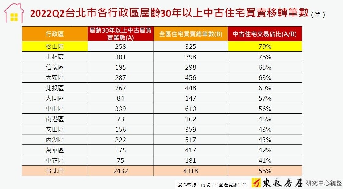東森房屋研究中心彙整內政部不動產資訊平台資料發現,進一步觀察各區表現可以發現,目前松山區30年以上中古屋交易佔比最高、達79%,其後分別是士林區(76%)、信義區(65%)、大安區(63%)、北投區(60%)。對此,東森房屋研究中心葉沛堯經理表示,目前北市精華區新建案的房價基本站穩三位數,預算相對有限的民眾大多會選擇屋齡較高的中古屋,一來可以用更友好的價格擁有北市門牌,二來也有機會等到都更或危老重建,坐享資產增值的紅利。