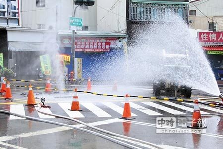 現場瀰漫瓦斯臭味,但行經的人車不明所以,仍熙來攘往通行,警消立刻通知警方協助疏散人車,並出動10輛水箱車圍住漏氣路口,輪流灑水稀釋不斷噴出的瓦斯。冒出的瓦斯氣體高約1層樓,附近店家嚇得紛紛走避。其中1家小吃攤趕緊關掉爐火,不敢再煮菜。