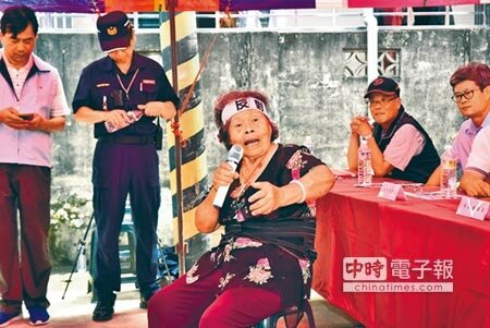 一名老婦人抗議高雄市政府在旗尾設立旗山生命紀念園區。(林瑞益攝)