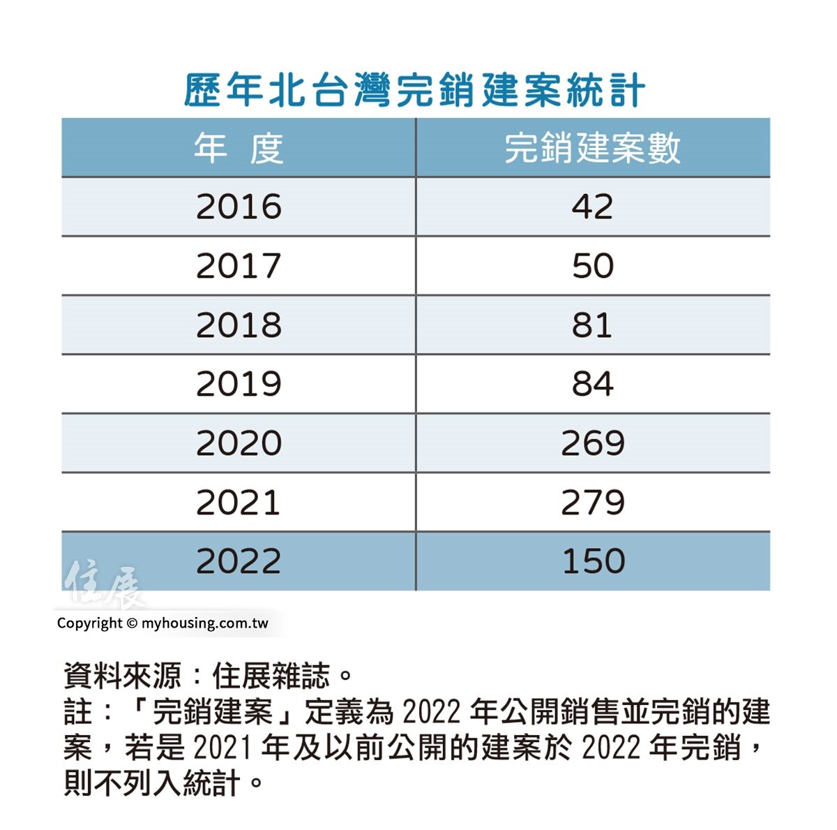 資金派對散場後,房市買氣趨緩,北台灣完銷建案數大幅下滑。據住展雜誌統計,截至今年12月16日止,北台灣完銷建案(2022年公開且完銷的建案)共計150個,較2021年(279個),大減逾四成。
