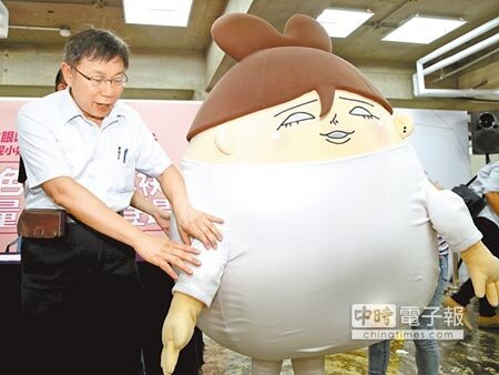為募款選舉經費,台北市長參選人柯文哲(左一)昨找來插畫家「翻白眼吧!溫蒂妮小姐」聯袂登場。(截取自中時電子報)
