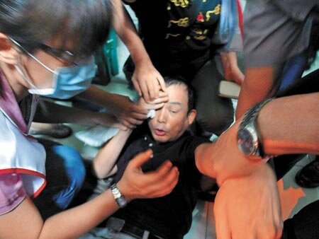 反南鐵東移自救會長蘇俊文在推擠中被意外絆倒受傷送醫。(記者洪榮志/攝影)