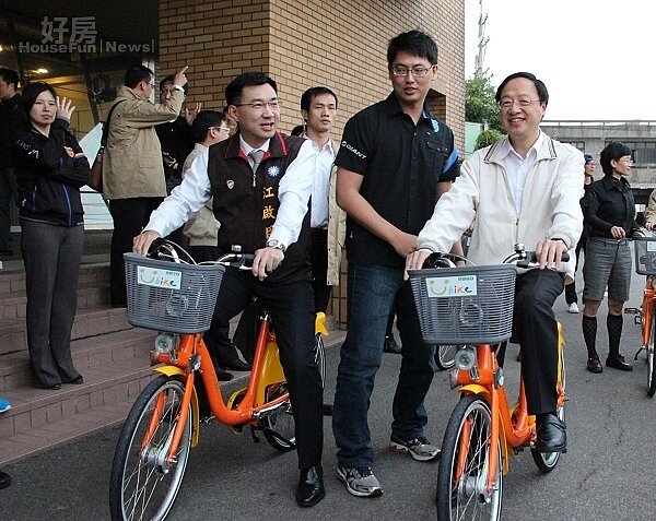 行政院長江宜樺6日下午蒞臨大甲區生產捷安特自行車的巨大公司參訪,與立委江啟臣騎乘微笑單車,了解車的功能性。(記者陳榮昌攝)