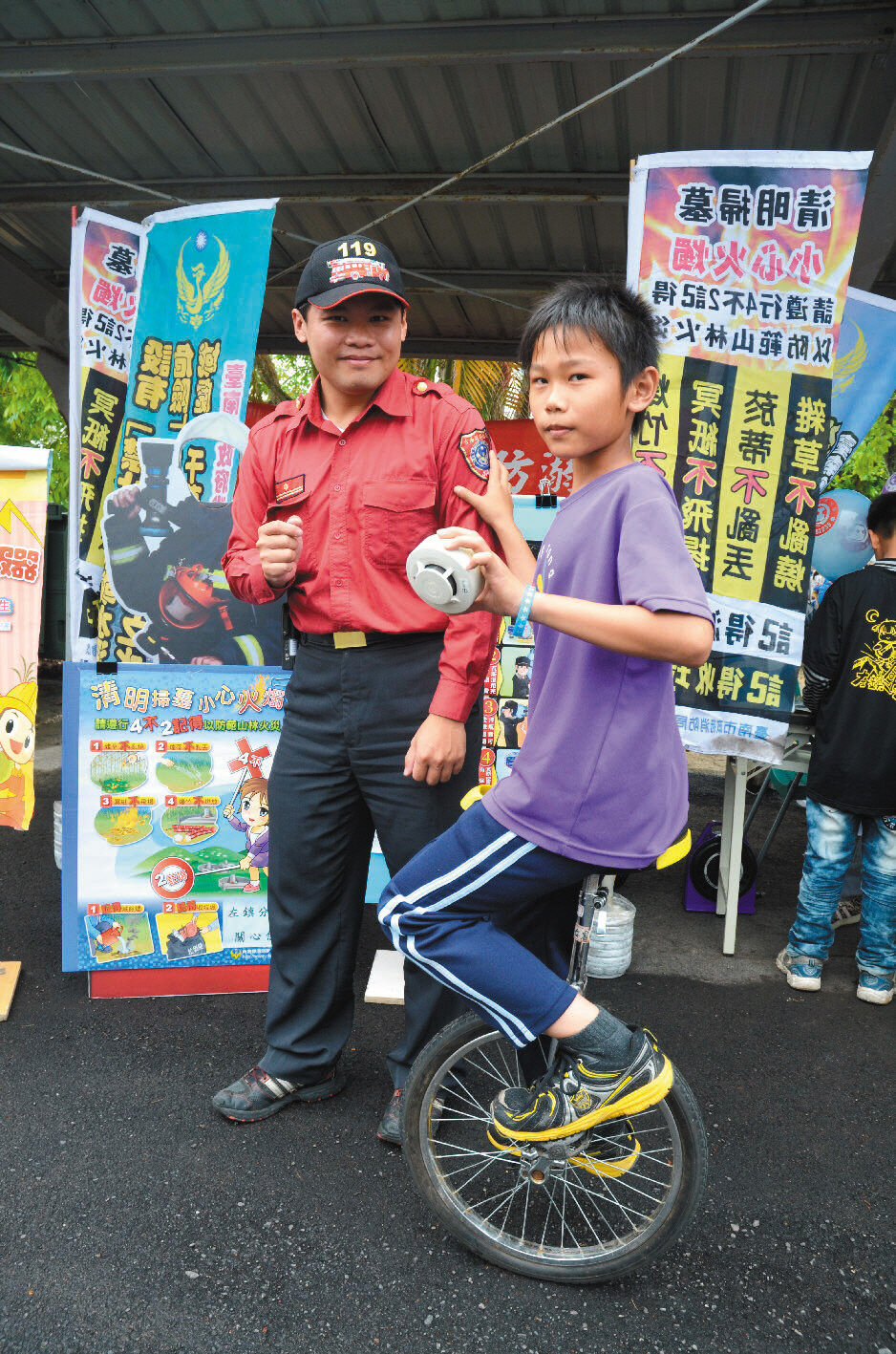 左鎮消防分隊長顏慶雲表示,光榮國小近年發展獨輪車運動,學生「騎」術相當厲害,左鎮消防隊昨天到左鎮國小舉辦三校聯合運動會宣導,特別邀請「獨輪車」騎士助陣,獨輪車繞著場地騎幾圈,消防人員再趁機發傳單,提醒民眾,清明節掃墓要記得「四不二記得」口訣,達到吸睛效果。
