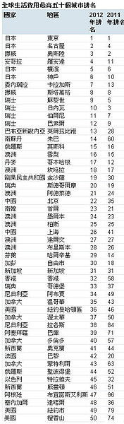 2012年台北繼續緊隨香港之後,唯香港今年的全球排名大幅颷升26個名次,目前全球排名為32位,而印尼則是最大跌幅的國家。印尼盾對主要貨幣表現疲弱,使首都雅加達的排名下滑32個名次,成為外派人員生活成本全球第123高的城市。至於巴基斯坦的卡拉奇持持續為亞洲區最低排名。