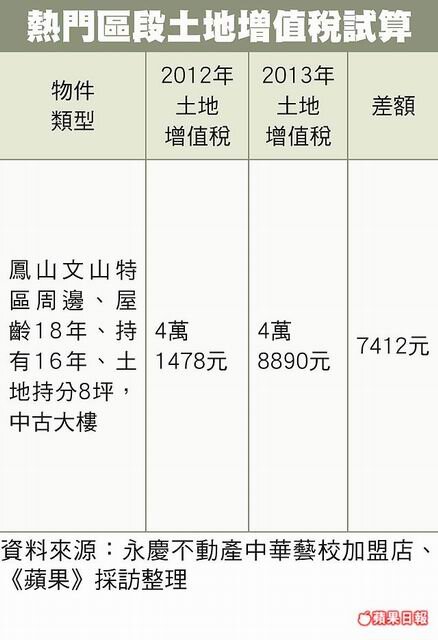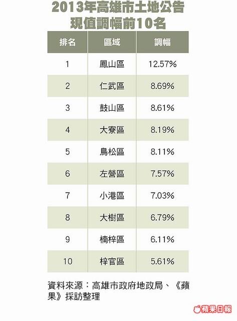 高雄市政府地政局統計,今年公告土地現值漲幅前3名為鳳山、仁武與鼓山區,其中鳳山區以調幅12.57%創下歷年新高,其次為仁武區及鼓山區,調幅都超過8%。