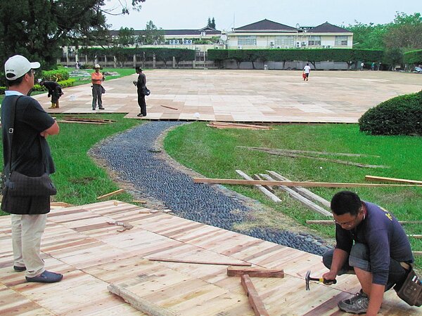 中台灣農業博覽會和世界茶業博覽會下月5日,在中興新村展開,最近工人修築場地,把親情公園的大草坪,全部鋪上棧板。宿舍區的居民對此不為然,他們擔心,一個月後,棧板掀開,大片的草皮,恐怕難再青翠了。