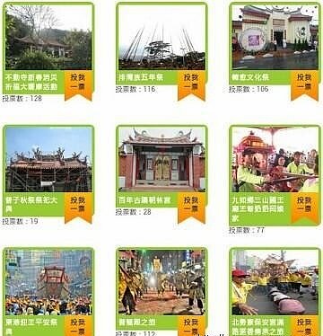 網路票選期間自8月20日起至10月20日下午6點結束,上網搜尋「宗教百景」、「宗教沃土」等關鍵字,就能找到票選活動網站(http://web.topwin.com.tw/WalkToTaiwan/ViewIndex.aspx),每人在活動期間可投6票。由於全國22個直轄市、縣市推薦多達417個宗教景點漫遊行程,競爭非常激烈,近日就有民眾在臉書上發言鼓勵鄉親踴躍投票,還有商家主動表達願意提供產品優惠,支持屏東的慶典入選宗教百景,展現愛鄉的熱情。