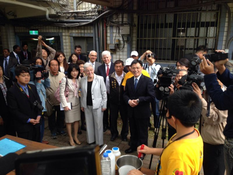 美國環保署署長吉娜‧麥卡錫(Gina McCarthy)及美國野生動物基金會執行長Laura Hickey等在環保署長魏國彥陪同下,前往建安國小頒發Eco-school綠旗認證。(圖/記者黃村杉攝)