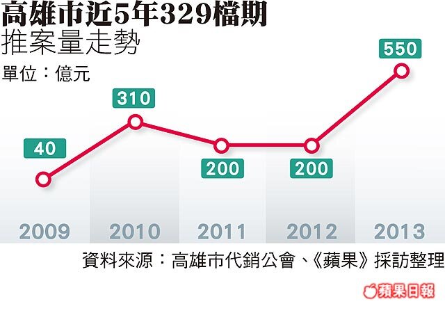 329檔期開跑,高雄推案量衝上550億元,較去年同期倍增,市區豪宅延續去年氣勢熱賣,外圍首購大樓也乘勢而起,2013年第2季房市持續升溫。