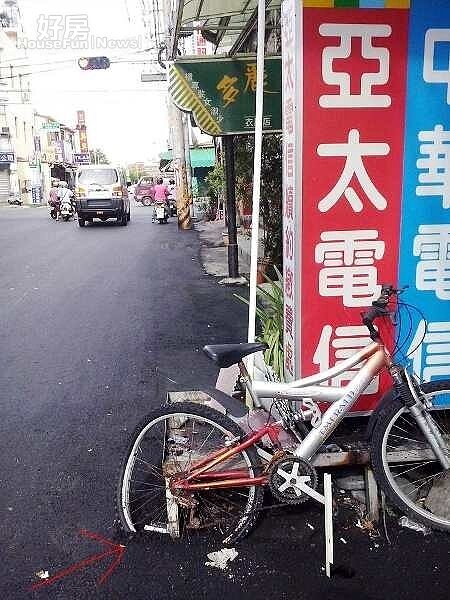 電信行李姓老闆說,這台腳踏車已經報廢,他為了讓落地招看得更清楚,所以用這輛腳踏車鎖在一旁,舖設柏油當天,他人不在社頭,以致半台車被埋進去,他並無責怪公所之意,也不想表示意見。