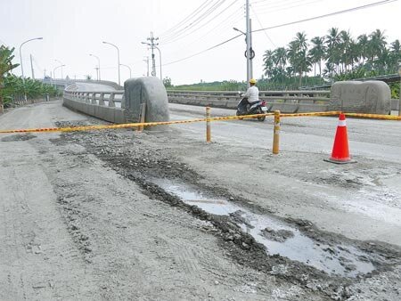 連接旗山溪洲、手巾寮的溪州大橋,因莫拉克風災沖毀造成交通不便,歷時2年半重建,通車不到7個月新橋卻因橋下方旗山溪疏濬工程,砂石車進出輾壓導致路面破損不堪,摔車事件頻傳惹民怨,強烈呼籲相關單位儘速處理。(記者劉宥廷/攝影)