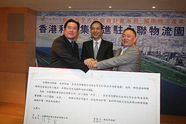 新北市政府努力招商拚經濟創造就業機會屢有亮麗政績,香港利豐集團進駐瑞芳永聯物流園區,4日於市府舉行簽約記者會,市長朱立倫指經濟不景氣,民眾不滿意,強調拚經濟不分黨派,市府團隊要以掃除投資障礙、擴大招商等策略,與全民一起拚經濟。香港商利豐物流進駐永聯,目前打造 7,000 坪 倉儲空間,建置高效能的倉儲營運系統,每天將有30~60 趟大型貨車出入,預計創造就業機會達200 人,園區將於102年3月正式啟用。