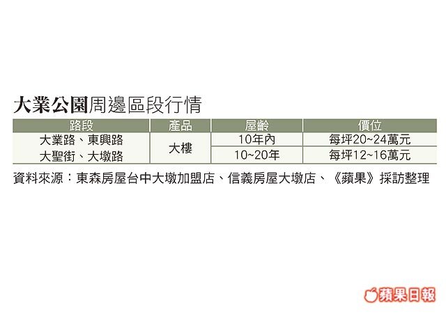 房仲業專案經理分析,該區為5期早期發展區段,周邊多屋齡15~20年大樓,從30~40坪、3房,到40坪以上、4房物件都有,集中在大業路、東興路沿線,依屋況、室內有無整理,每坪12~15萬元,「這裡生活機能太好了,不管屋齡多舊的房子都有人願意購買。」