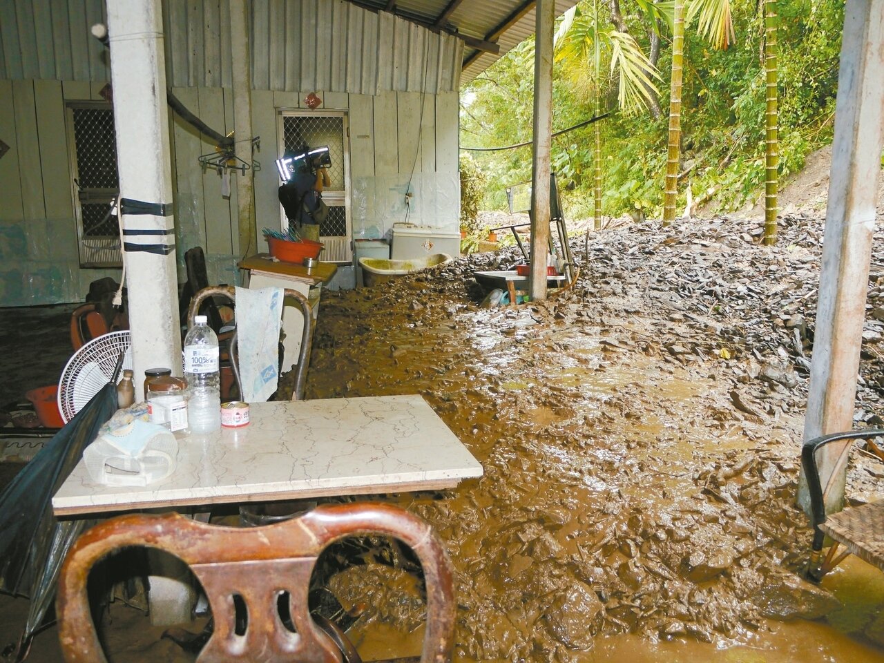 六龜大津里因連日下雨導致土石鬆軟,昨晨七時許,大量土石泥流灌入台廿七線旁一戶民宅屋內,土石覆蓋洗手台、桌椅等農具與家具,廚房、客廳地面全是爛泥巴,最深處達一公尺,只有地勢較高的臥室倖免於難,住戶李昆海拿掃帚忙著清理家園。