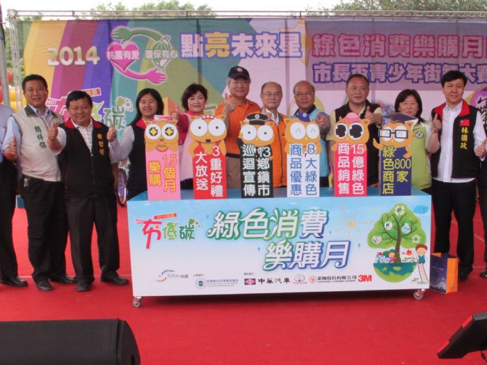 「2014綠色消費樂購月」系列活動,首站在桃園市陽明公園熱鬧展開序幕,啟動儀式由縣府副秘書長蔡宗烈、桃園市長蘇家明主持,同時,呼籲全體民眾「消費不浪費,一齊作環保,省能愛地球」,共同響應參與「2014綠色消費樂購月」活動。