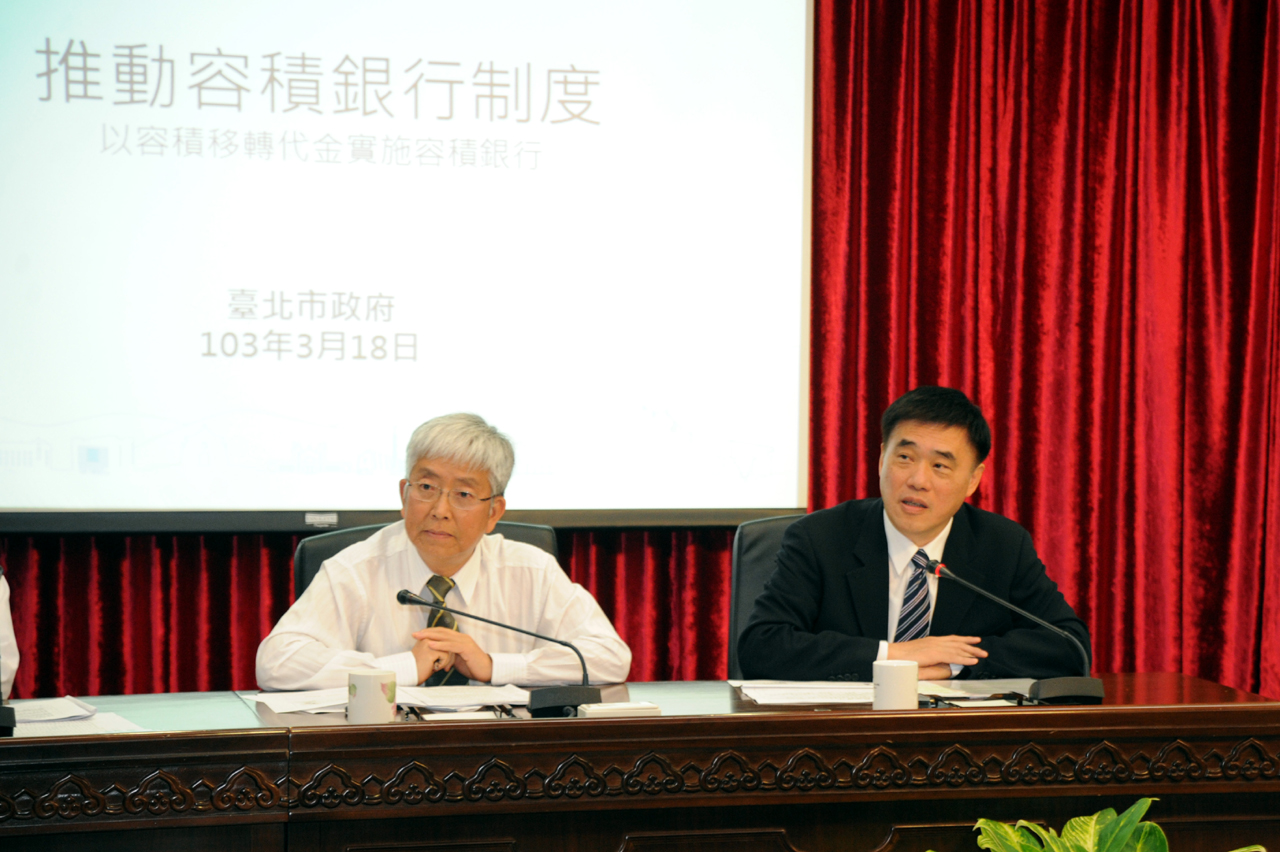 郝龍斌表示,都市容積應是一種「公共財」,但現行容積移轉制度,因為市場資訊不透明、中間人介入等因素,利益全都流入私人口袋,市府希望透過容積銀行制度,把移轉過程中所增額利益,回歸用於公共建設,藉此創造新舊市區雙贏。郝龍斌指出,市府審議通過的「臺北市都市設計及土地使用開發許可審議委員會設置辦法」修正案,預定月底送議會審議,議會審議順利的話,臺北市將可成為全國第一個推動以「市價」為計算基礎的容積代金制度。