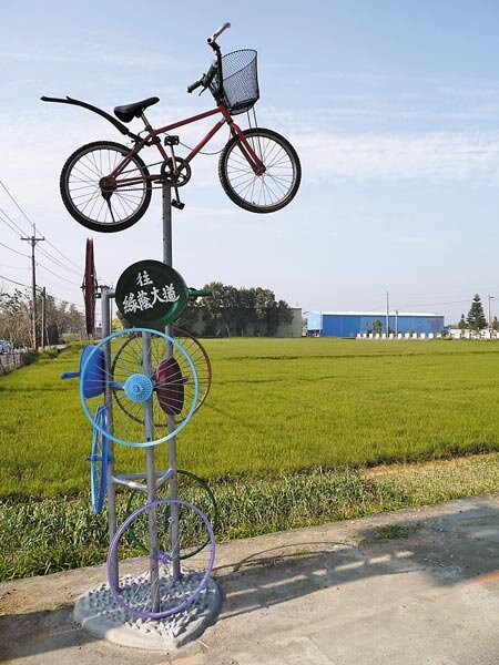 觀音鄉廣福村民以舊腳踏車鋼圈、風扇葉片等廢物發揮巧思再利用,點綴村內的「綠蔭大道」,在田野間形成獨特的裝置藝術,讓台北人都前來取經。(圖/蔡依珍攝)