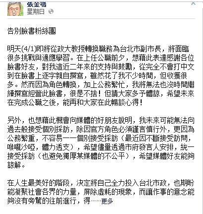 前晚七點,他在臉書發文,指未來可能無法像過去般接受個別採訪,除因官方角色必須謹言慎行外,也因公務繁重,不容易一一個別受訪,希望儘量透過市府發言人安排,統一受訪。