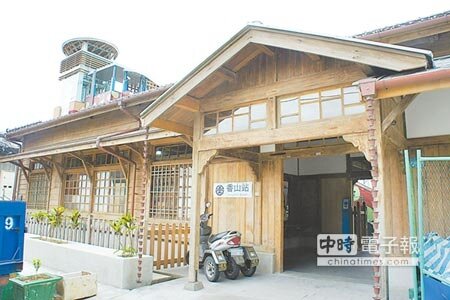 香山火車站是市定古蹟,建於昭和3年,距今86年,是典型「入母屋造式」的木造建築,這類款式的最大特色是屋頂左右兩端山牆部分,再叉出三角形底邊等寬的屋簷,日本式屋頂大都採這個樣式。