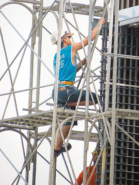 益通光能南科新廠區大樓正趕工興建,工人在高空固定鋼架。 (圖/周宗禎攝)