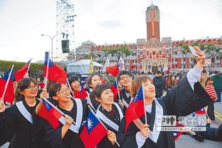 蔡英文總統昨天出席總統府升旗音樂會,在45位國軍楷模領唱下,不再迴避歌詞中的「吾黨所宗」,與現場民眾齊唱整首國歌,蔡英文隨後也在臉書中發表升旗時仰頭觀看的照片,強調「2017我們一起」,來迎接新的一年。