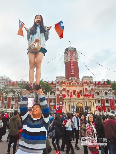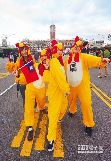 不少學生族群則是摸黑從台北市政府前廣場參加完跨年活動後,直接來總統府廣場排隊進入管制區參加升旗,還有的民眾特別作造型,全身著金雞裝、著畢業學士服,互道「新年快樂」。